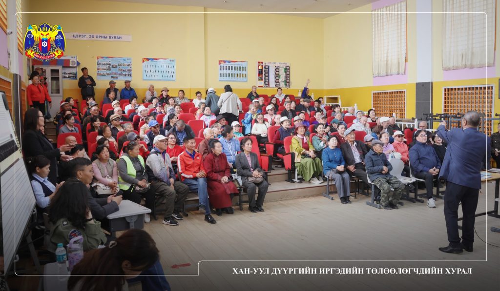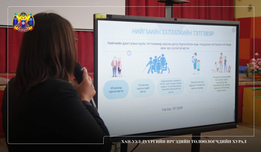 Хан-Уул дүүргийн Засаг даргын Тамгын газар, Нийгмийн даатгалын газар, Хөдөлмөр, халамжийн үйлчилгээний хэлтэс, Ахмадын хороотой хамтран 4, 5, 6, 7, 8, 9, 10, 12, 13, 14, 16, 21, 23, 24, 25 дугаар хорооны 221 ахмад настан, зорилтот бүлгийн иргэдэд Халамжийн болон Нийгмийн даатгалын тухай хуулийн нэмэлт өөрчлөлтийн талаарх мэдээлэл хүргэх өдөрлөгийг ЕБ-ын 7 дугаар сургуулийн урлаг зааланд зохион байгууллаа.